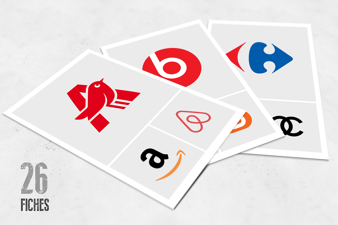 Avec trois différents signes par fiches, ces supports donnent à voir la variété de formes que peuvent prendre la lettre tout en identifiant les constantes qui définissent sa forme. La compréhension est ici facilitée par le choix de logos dont l’emblème est une lettre de l’alphabet, mais aussi la première lettre du nom de la marque.